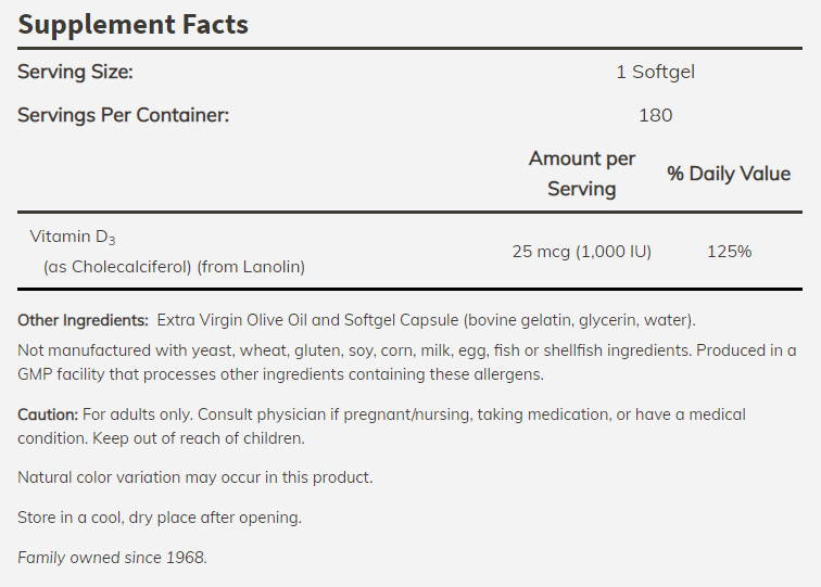 NOW - Витамин D-3 1000 IU - 180 Дражета