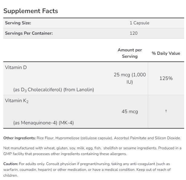 Към формулата е добавен витамин К2, който играе важна роля за усвояването на калция и здравината на костите.